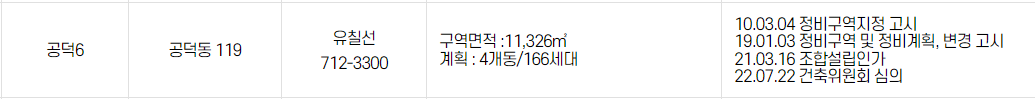 공덕 6 구역은 2010년 3월 4일에 정비구역으로 지정되었고 2021년 3월 16일 조합이 설립되었고 2022년 7월 22일에는 건축위원회 심의를 받았습니다.