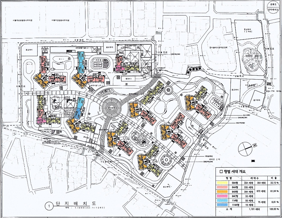 단지배치도의 모습입니다. 가운데에는 중앙 공원이 위치하고 있습니다. 총 1101세대로 59A형 354세대, 84형 672세대, 114형 75세대로 구성되어 있습니다.