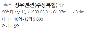 정우맨션은 사용승인일이 1983년 8월 31일인 15층 주상복합 아파트로 총 90세대가 거주하고 있습니다.
