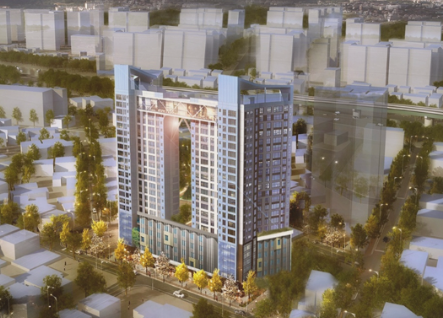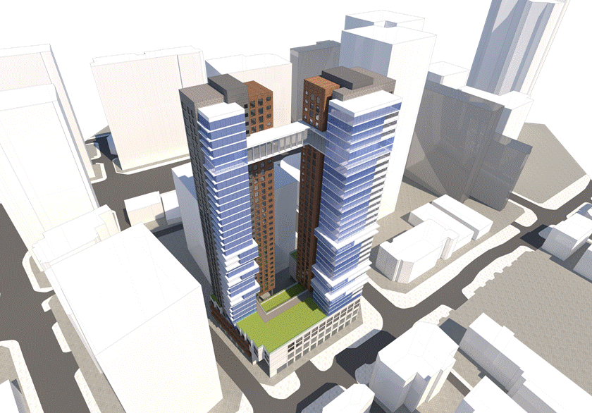 조감도를 보니 저층부에는 상가가 들어서고 상가 위로 2개 동에 스카이브리지가 설치되는 것으로 보이네요.