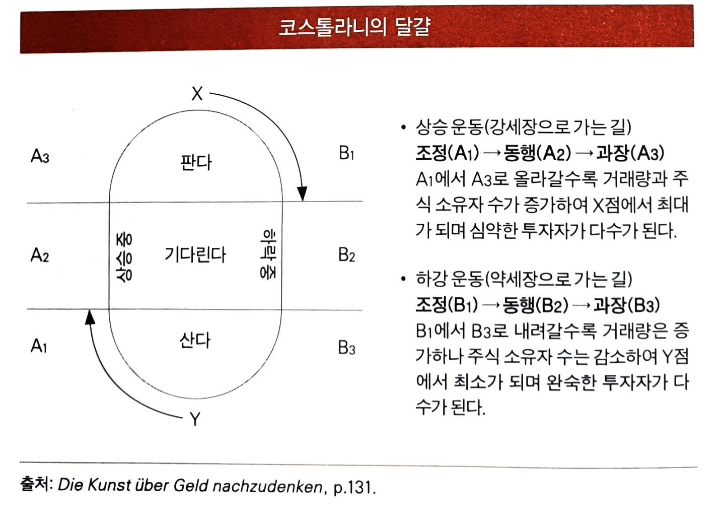 "시장이 좋은 소식이나 나쁜 소식에 대해 얼마나 강하게 반응하는가는 단 하나의 질문에 달려 있다. 즉 증권이 완숙한 거래자의 수중에 있는가, 아니면 심약한 거래자의 수중에 있는가? 증권이 심약한 거래자의 수중에 있다면 매우 좋은 소식이 있어도 별다른 영향이 없다. 반대로 나쁜 소식은 폭락으로 이어진다. 반면 완숙한 거래자가 주식 대부분을 가지고 있다면 좋은 소식은 매우 행복한 영향을 미치지만 나쁜 소식은 아무런 반응도 일으키지 못한다. 나는 첫 번째 상황을 '과매수시장', 두 번째 상황을 '과매도시장'이라고 부른다.