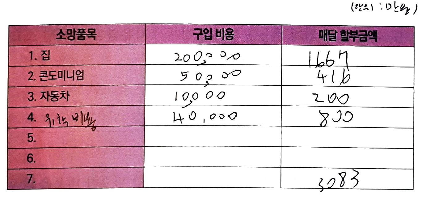 -> 위 그림은 이자만으로 내가 원하는 생활을 하기 위해 필요한 돈을 이자수익만으로 충당하려면 얼마만큼의 돈이 있어야 하는지를 계산하는 방법이다. 내 경우에는 소망하는 집과 자동차, 교육비용을 충당하기 위해 월 3083만 원이 필요하고 월 생활비 300만 원을 합해서 월 3383만 원이 필요하다는 계산이 나왔다. 이를 연이율 8% 기준으로 계산했을 때 50억 7천만 원이 필요하다. 여기서 안전마진을 더해 60억이 필요하다는 결론을 내렸고 10년 뒤 60억을 벌기로 목표를 세웠다.