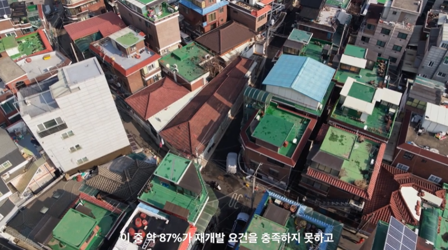 서울시 저층 주거지 면적은 전체 주거지의 약 41.8%를 차지하며 이 중 약 87%가 재개발 요건을 충족하지 못하고 마땅한 정비방안 없이 방치되어 있는 실정입니다.