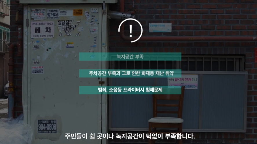 특히 이런 지역들은 좁은 대지에 다세대, 다가구주택이 협소하게 건축되어 주민들이 쉴 곳이나 녹지공간이 턱없이 부족합니다. 또한 심각한 주차난으로 인한 주민 갈등과 분쟁도 매우 잦을 뿐만 아니라 화재 등 재난에도 취약한 실정입니다.